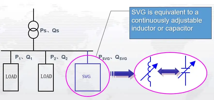 SVG is the representative of the latest technology in the field of reactive power compensation, SVG is connected in parallel to the power grid, which is equivalent to a variable reactive current source. Its reactive current can quickly change with the change of reactive load current and compensate the reactive power required by the system automatically . Because SVG has a very short response time, it is also called Static Synchronous Compensator (STATCOM).
