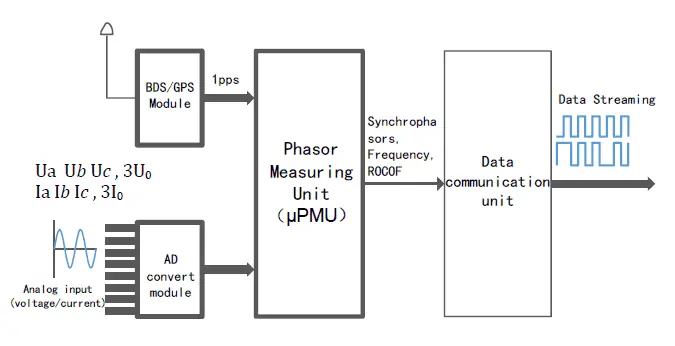 PMU (phasor measurement unit), A stand-alone device or module. The voltage/current sampling data are all with a BDS/GPS timestamp accurate to US level.