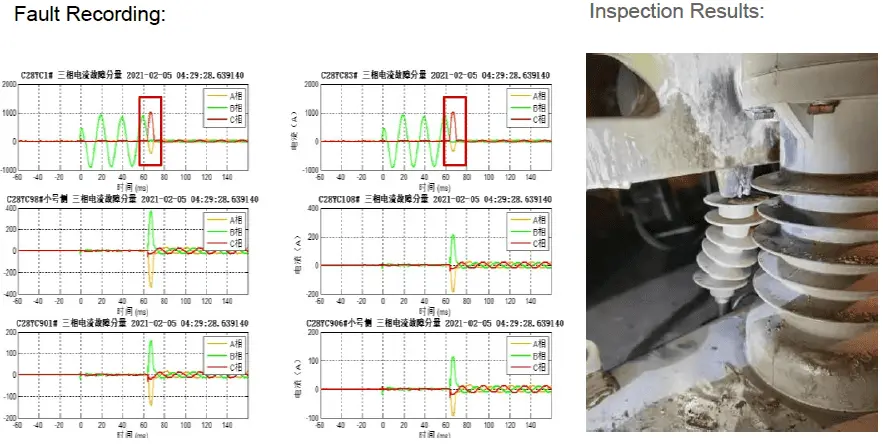 • After tens of milliseconds, the phase C conductor at the pole 52# of Line 115 also falls off the cross arm, causing short circuit of Phase A and C. When the peak of short-circuit current exceeds 5000A, the relay protection at the outlet of the line is operated. After the switch trips, the system runs normally, indicating that the insulation of the original breakdown point of the pole 29# of the line 117 is restored.